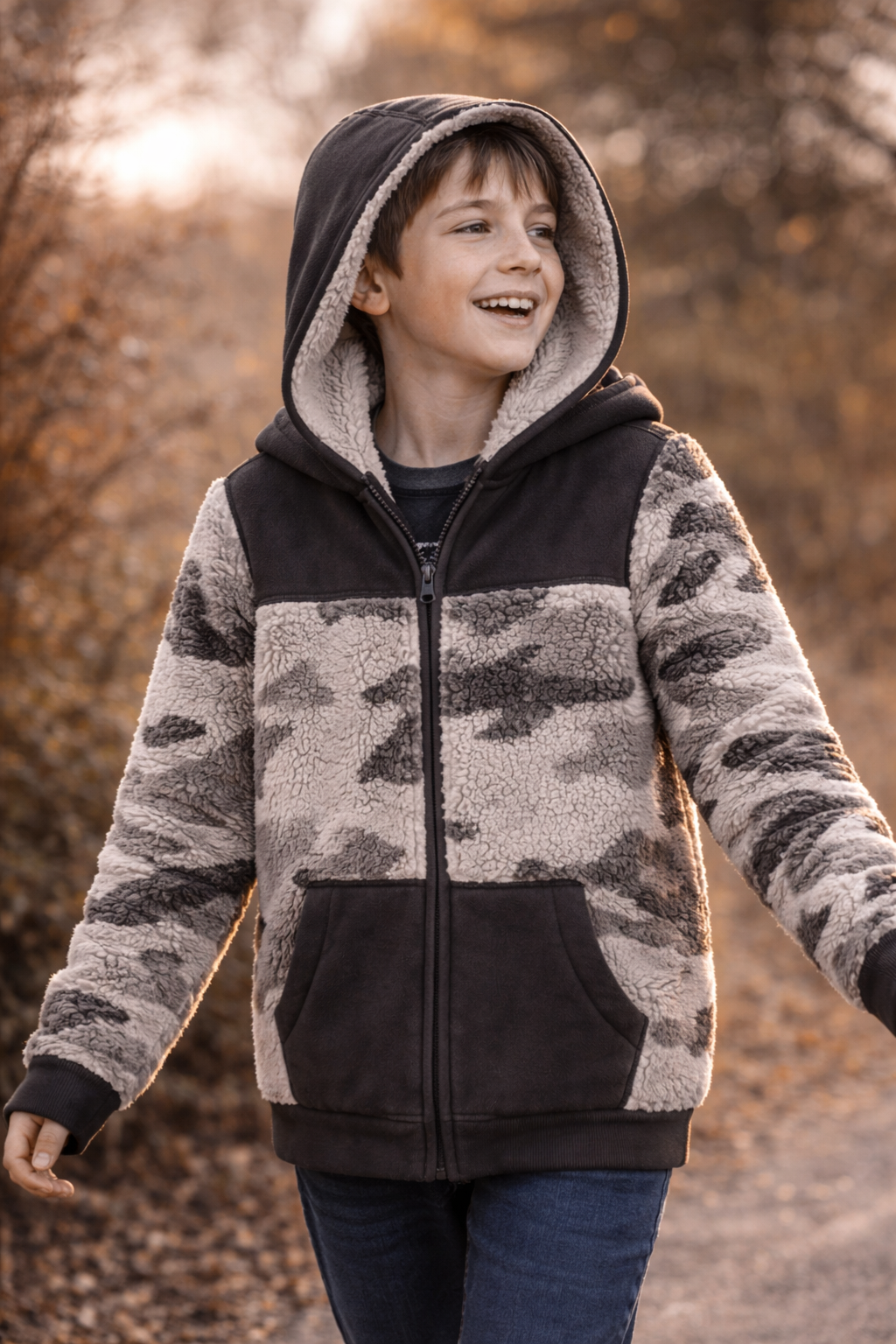 Lindo agasalho com zíper frontal, totalmente forrado de lã, bolso estilo canguru e capuz.