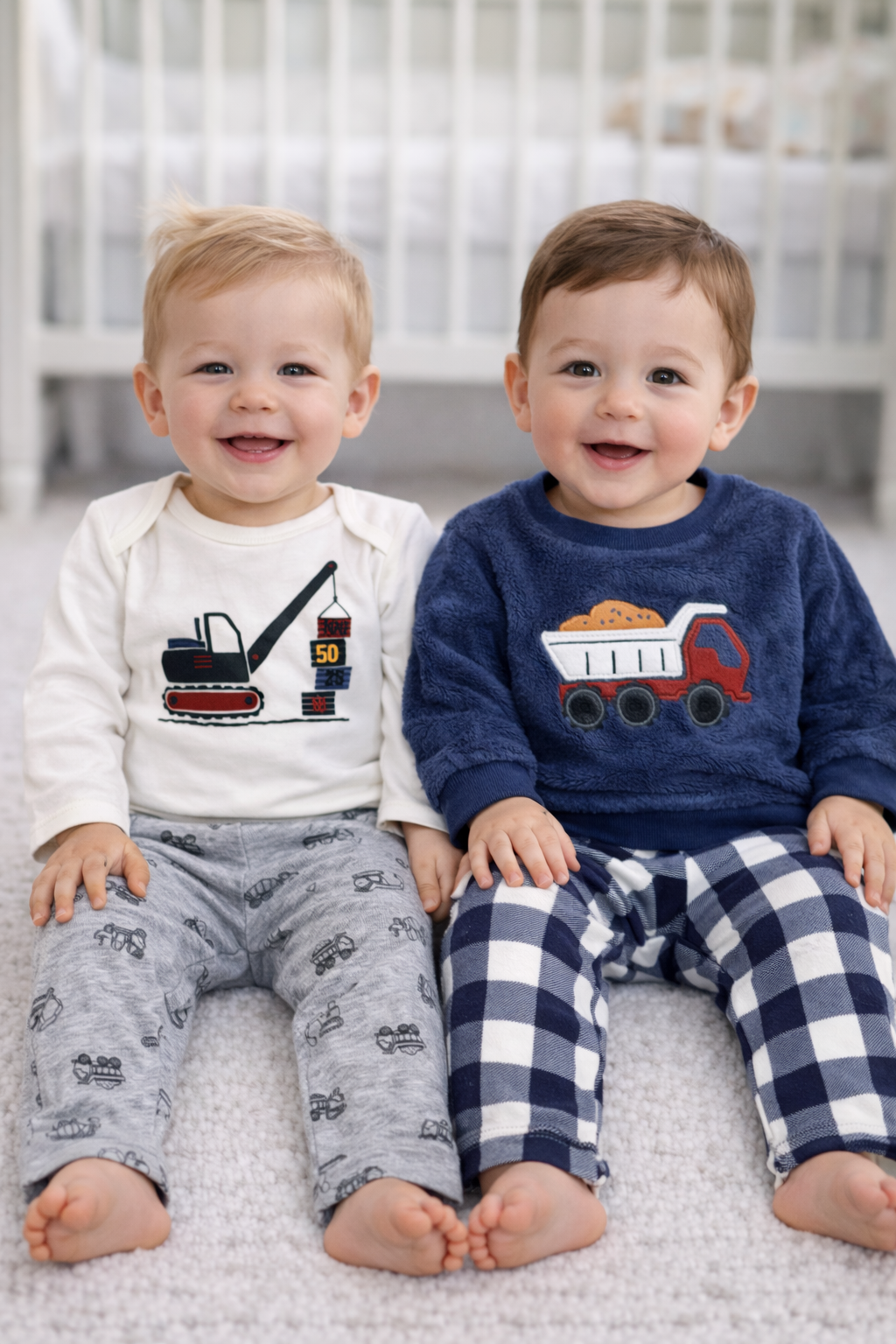 - Agasalho de pelúcio com bordado: 100% poliéster microfleece; - 2 Calças legging: 100% algodão;