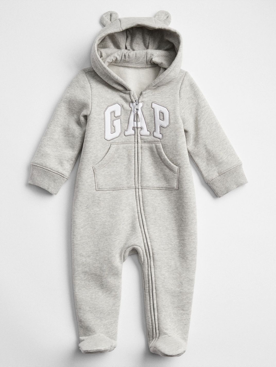 Lindo macacão com bolso estilo canguru e capuz. O capuz tem fofinhas orelhonhas de ursinho. Bonito e confortável, possui ótimo acabamento e cuidados em todos os detalhes. Foi feito para seu filho se sentir nas nuvens. Excelente opção para dias frios! Além disso, pode ser lavado quantas vezes for preciso e não vão perder a cor. Uma qualidade GAP!