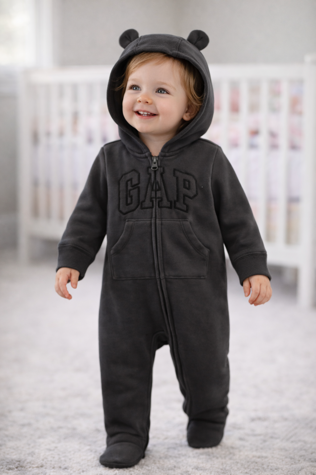 Lindo macacão com bolso estilo canguru e capuz. O capuz tem fofinhas orelhonhas de ursinho. Bonito e confortável, possui ótimo acabamento e cuidados em todos os detalhes. Foi feito para seu filho se sentir nas nuvens. Excelente opção para dias frios! Além disso, pode ser lavado quantas vezes for preciso e não vão perder a cor. Uma qualidade GAP!