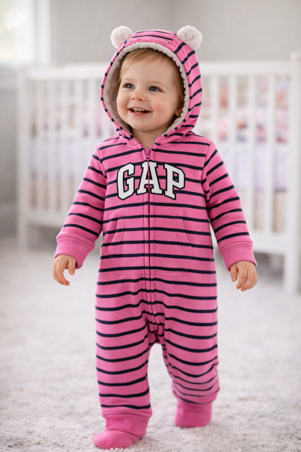 Lindo macacão com bolso estilo canguru e capuz. O capuz tem orelhinhas fofinhas de ursinho. Bonito e confortável, possui ótimo acabamento e cuidados em todos os detalhes. Foi feito para sua filha se sentir nas nuvens. Excelente opção para dias extremamente frios! Além disso, pode ser lavado quantas vezes for preciso e não vão perder a cor. Uma qualidade GAP!